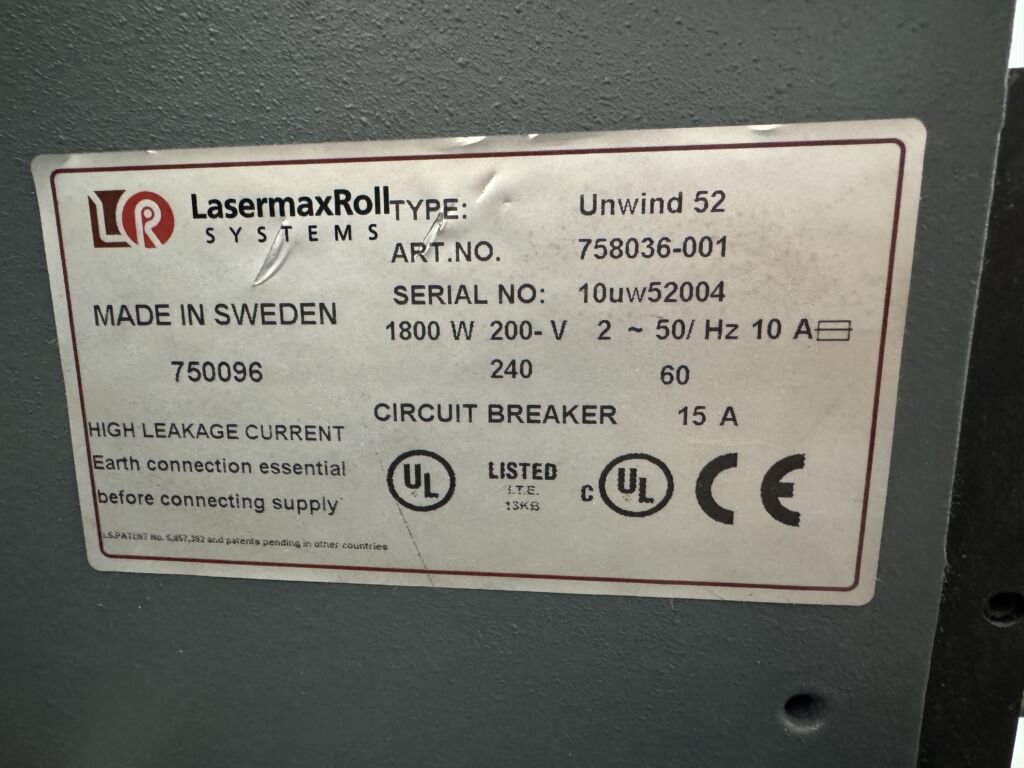 The Lasermax Roll Unwind 52 is known for its quick roll loading and changing capabilities, and its ability to maintain consistent tension and alignment, making it ideal for high-speed, uninterrupted printing operations.